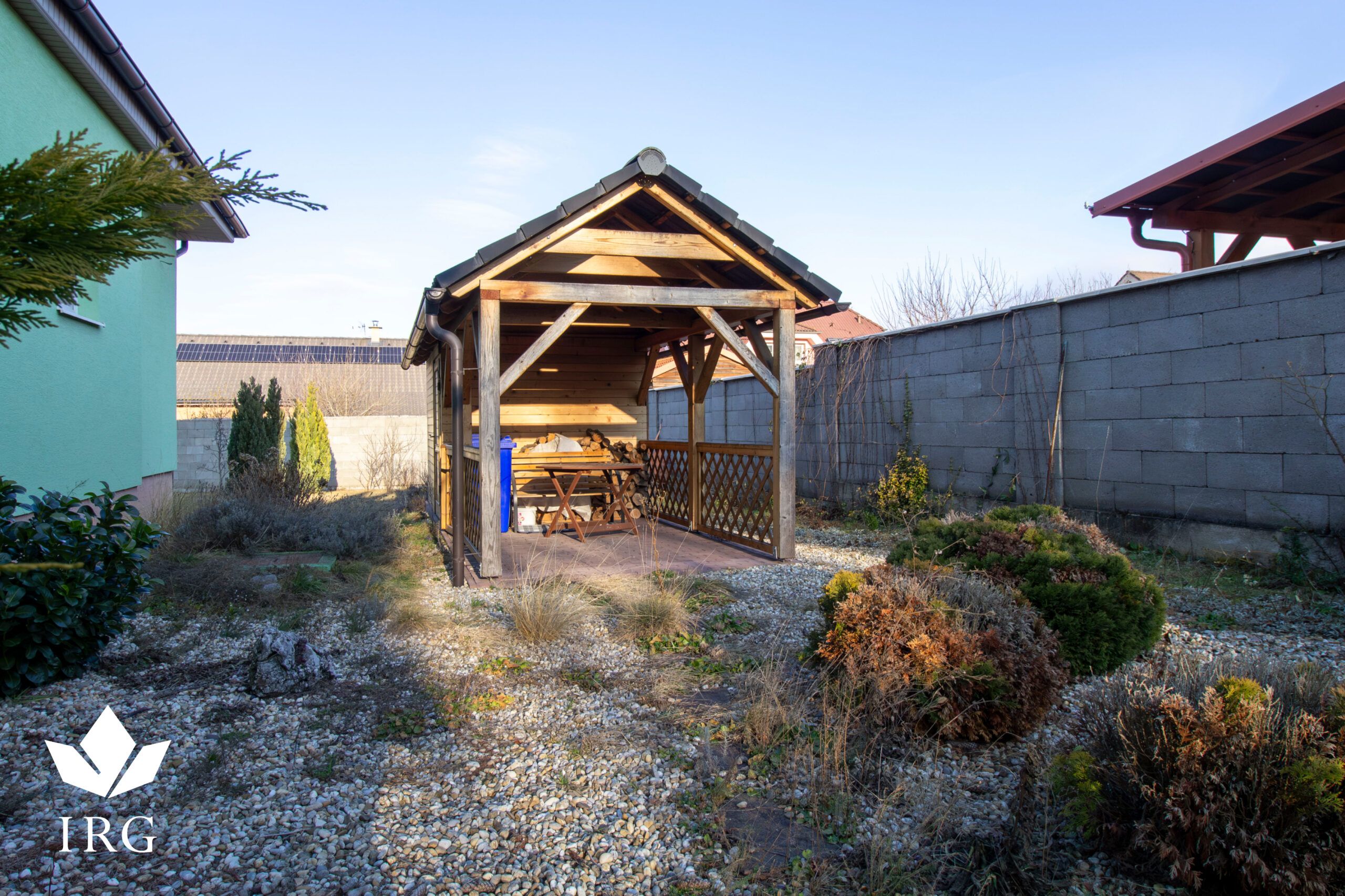 Súčasťou exteriéru je príjemná terasa prístupná z dennej časti domu, záhrada s dostatkom priestoru pre deti, záhradku či bazén, drevený altánok na dvore – ideálne miesto na letné posedenia, grilovanie či stretnutia s rodinou a priateľmi
